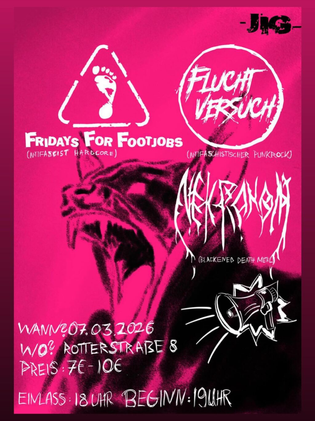 Im März geht’s wieder ordentlich rund im JiG! Am 07.03.26 stehen bei uns @nekronom.band @fluchtversuchband und @fridaysforfootjobs auf der Bühne. Eintritt: 7-10€. Um 19 Uhr geht’s los, kommt zahlreich, wir[…] Read more